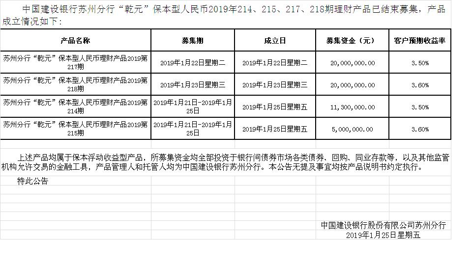 中国建设银行苏州分行“乾元”保本型人民币2019年214、215、217、218期理财产品成立公告